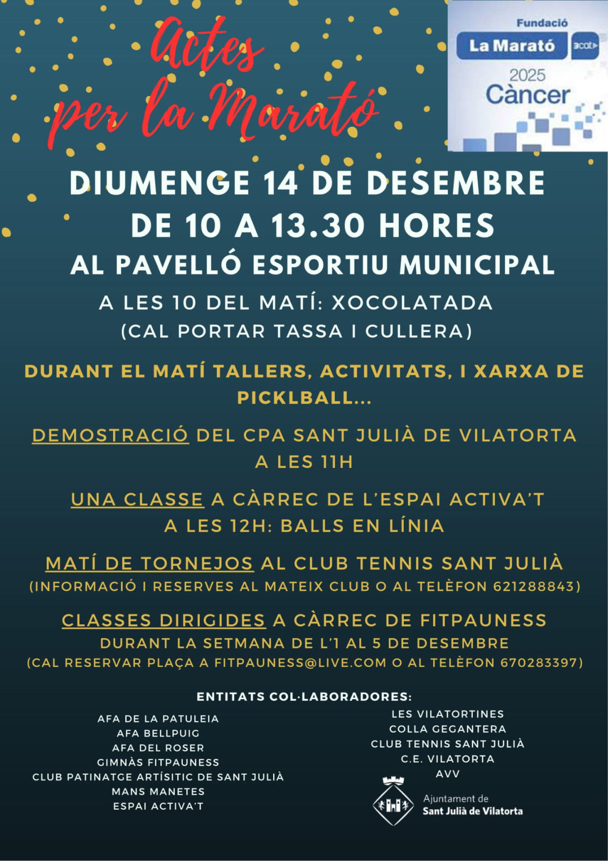 Comprar entradesEl món de la raqueta també tindrà el seu protagonisme. El Club Tennis Sant Julià ha preparat un matí de tornejos que combina esport, diversió i convivència. Hi haurà una americana de pàdel mixt, oberta a jugadors i jugadores de tots els nivells, i un torneig de tennis per a pares i fills, pensat perquè les famílies puguin gaudir junts de l’activitat física. Totes dues propostes estan obertes a tothom i les inscripcions es poden gestionar al mateix club. Els donatius recollits durant els tornejos es destinaran també a La Marató.
