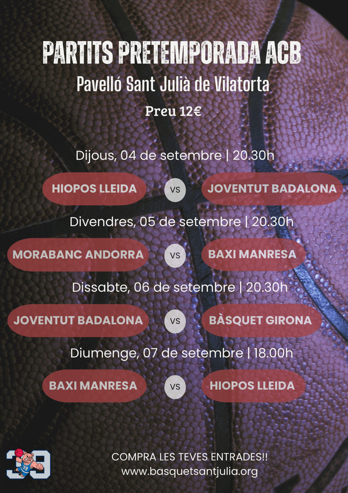 Comprar entradesEl Torneig es disputarà del 4 al 7 de setembre de 2025. Durant el 39è Torneig es realitzen activitats relacionades amb el bàsquet, com el Clínic per a entrenadors, la Taula Rodona Medicina i Bàsquet i els concurs de triples, tots ells d’inscripció gratuïta. A més, podreu gaudir dels ja habituals partits d'exhibició de pre-temporada ACB, així com de moltes activitats lúdiques.