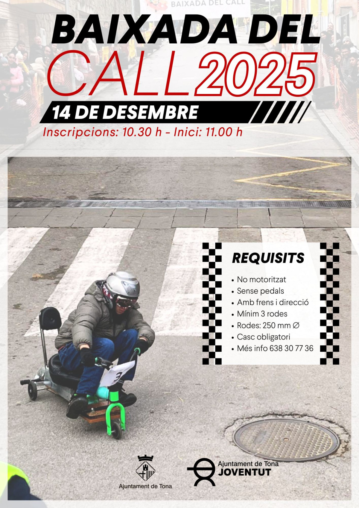 Prepara el teu vehicle i participa a la Baixada del Call. Requisits: No motoritzat Sense pedals Amb frens i direcció Mínim 3 rodes Rodes: 250 mm ⌀ Casc obligatori Més info 638 30 77 36