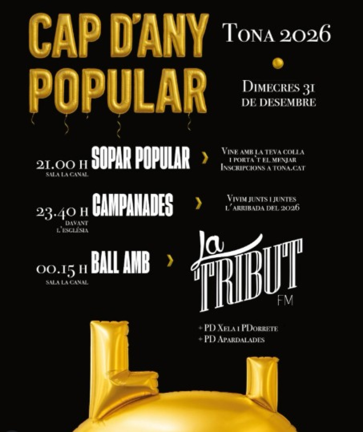 ๐ฅ CAP D'ANY POPULAR 2026 ๐ฅ Torna un any mรฉs el ja mรญtic Cap d'Any Popular de Tona. Celebrem junts i juntes l'arribada del 2026! ๐ฝ๏ธ ๐ฎ๐ญ-๐ฎ๐ฏ:๐ฏ๐ฌ: ๐ฆ๐ผ๐ฝ๐ฎ๐ฟ ๐ฝ๐ผ๐ฝ๐๐น๐ฎ๐ฟ Vine amb la teva colla i porta't el menjar. Formulari d'inscripciรณ a tona.cat ๐พ ๐ฎ๐ฏ:๐ฐ๐ฌ ๐๐ฎ๐บ๐ฝ๐ฎ๐ป๐ฎ๐ฑ๐ฒ๐ Vivim junts i juntes l'arribada del 2026 davant l'Esglรฉsia de Sant Andreu. ๐ค ๐ฌ๐ฌ:๐ฏ๐ฌ ๐๐ผ๐ป๐ฐ๐ฒ๐ฟ๐ amb LA TRIBUT FM ๐๐ผ๐ธ I desprรฉs... ๐ฅณ ๐๐ถ๐ป๐ฎ๐น ๐ฑ๐ฒ ๐ณ๐ฒ๐๐๐ฎ amb PD Xela i PDorrete i PD Apardalades! ๐ถ