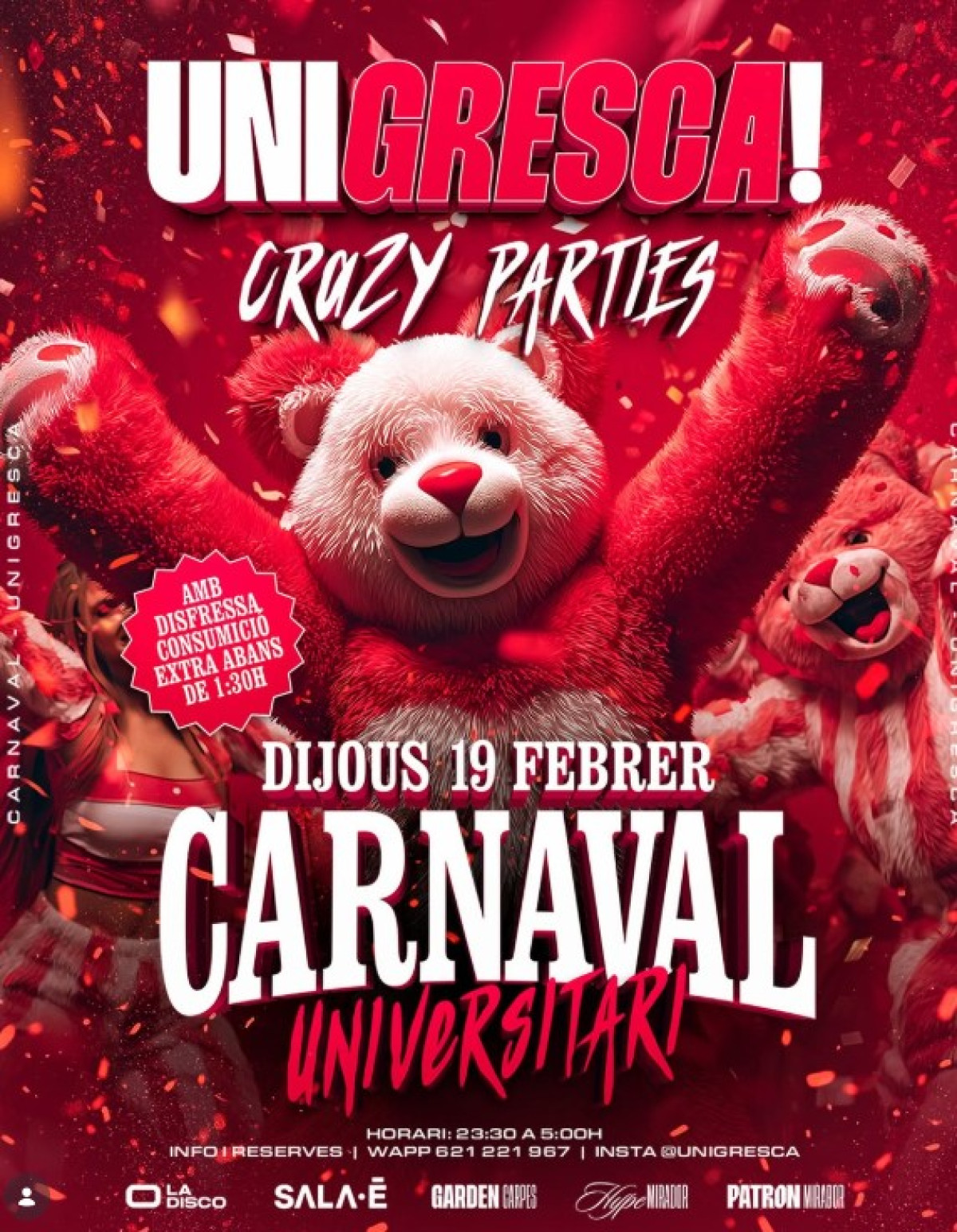 🎭🔥 CARNAVAL UNIVERSITARI A UNIGRESCA 🔥🎭 Arriba la festa més salvatge del carnaval… i tu no te la pots perdre! 🐻❄️❤️ Disfressa’t, vine amb la colla i prepara’t per una nit de CRAZY PARTIES fins que surti el sol 💃🕺 Confeti, música, bon rotllo i moltíssima bogeria 🎶✨ Ens veiem a la pista! 🔥