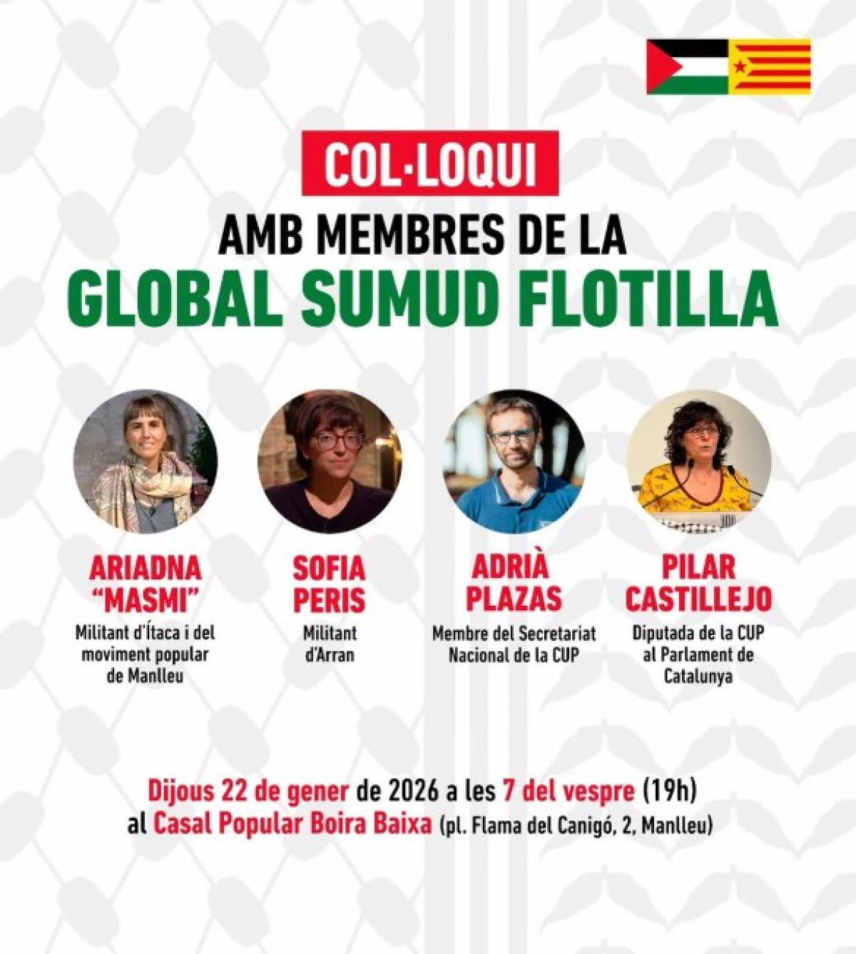 🗣️ Col·loqui amb les integrants de la @globalsumudflotilla Pilar Castillejo (@pili.castillejo), Adrià Plazas (@cupnacional), Ariadna "Masmi" (@masmikakau) i Sofia Peris (@arrancassoles).