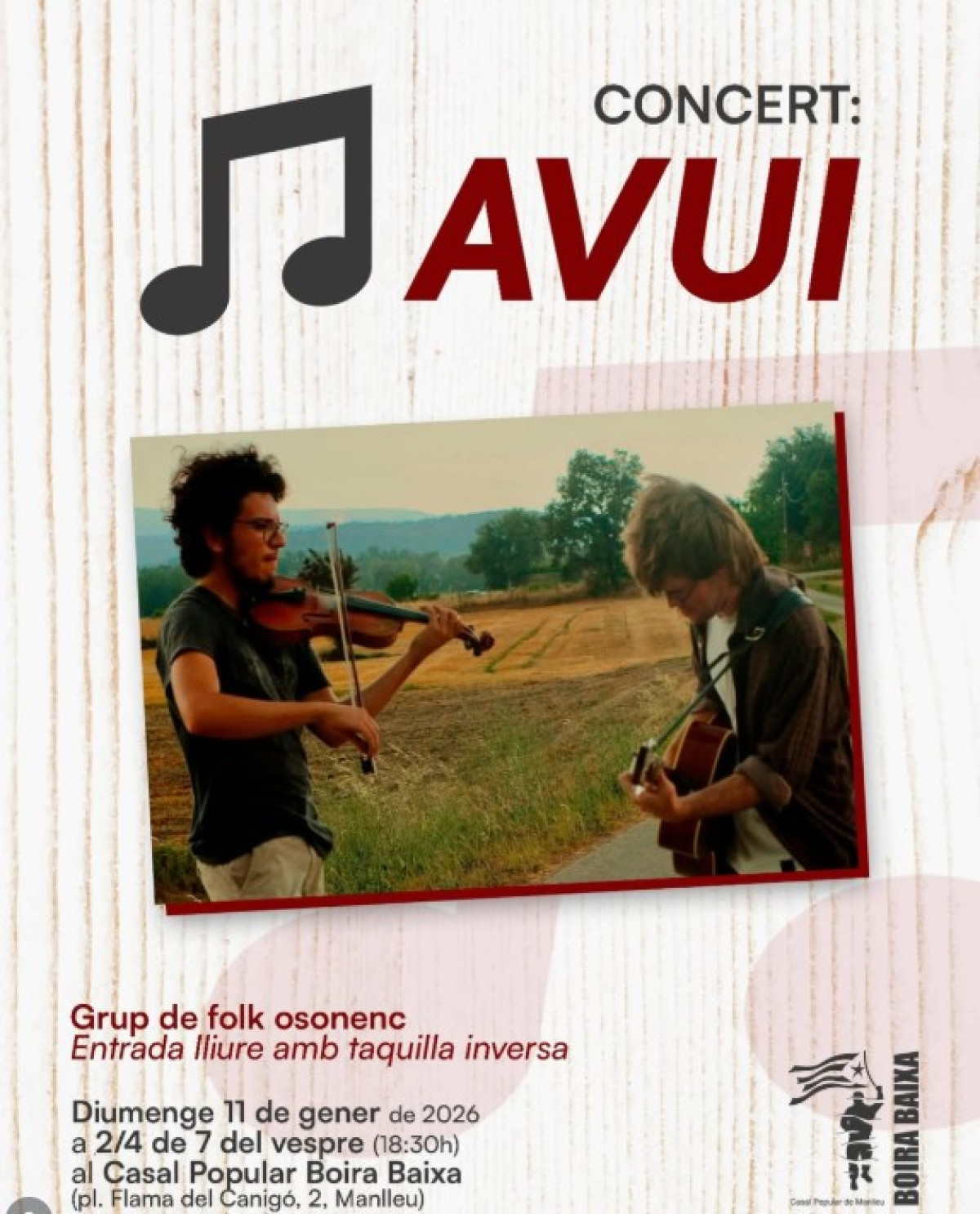 🎶 Concert d'@avuiavuiavui, grup de folk osonenc, al @casalboirabaixa de #Manlleu! 🎫 Entrada lliure amb taquilla inversa. 🗓️ Diumenge 11 de gener, a 2/4 de 7 del vespre (18:30h).