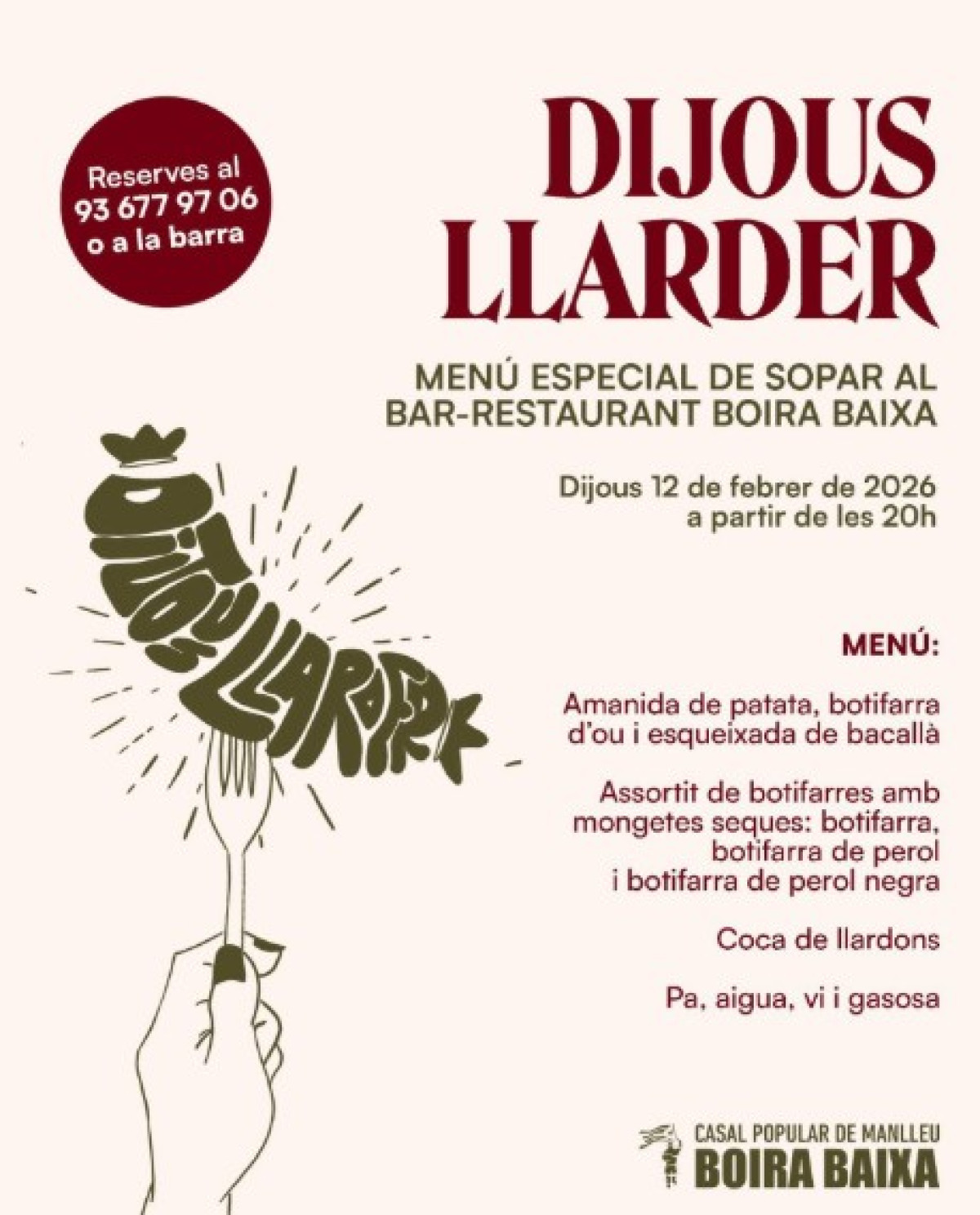 El 12 de febrer, celebrarem el DIJOUS LLARDER al bar-restaurant Boira Baixa de #Manlleu amb un menú especial de sopar. 📞 Reserves al 93 677 97 06 i a la barra. Mantenim vives les tradicions!