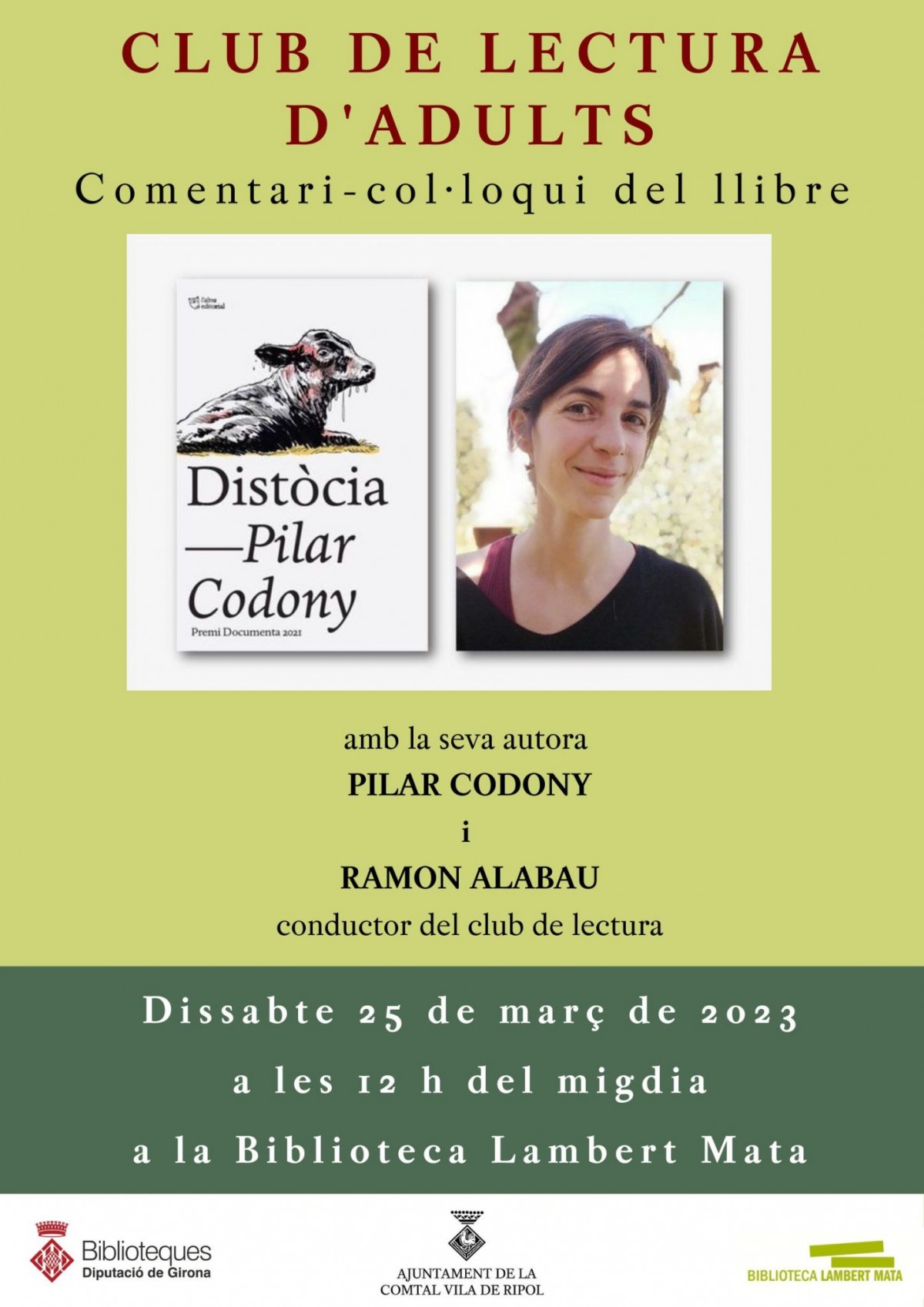 Club de lectura d’adults, comentari col·loqui del llibre Distòcia de Pilar Codony, amb la presència de l’autora que conversarà amb el moderador del club Ramon Alabau.