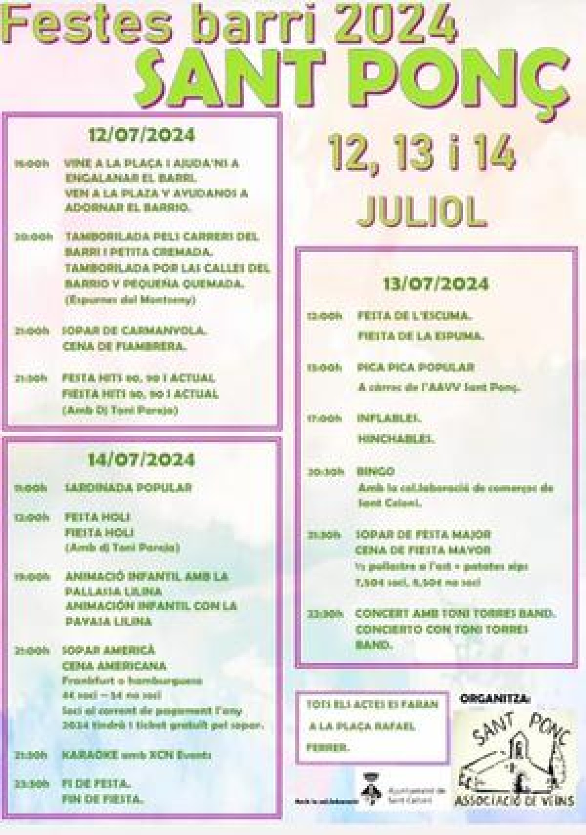 Festa de l'escuma, 12.00. Pica pica popular a càrrec de l'AAVV de Sant Ponç, 13.00. Inflables, 17.00. Sopar de festa major: pollastre a l'ast i patates xips (Preu: 7,50 euros socis i 8,50 euros no socis), 20.30. Concert amb Toni Torres Band, 22.30.