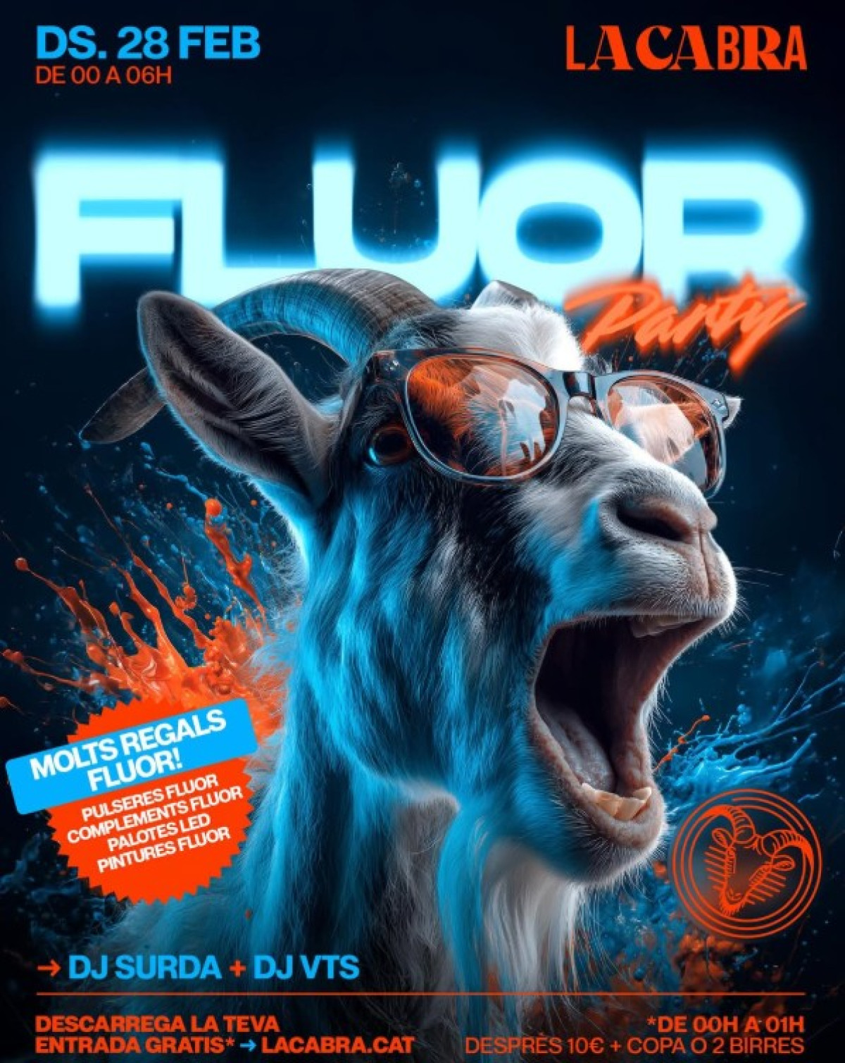 Torna la festassa que il·lumina TOTAAA LA PLANA!!! 🤩Brillarem més que mai, a la Fluor Party✨ amb MOLTÍSSIMS REGALS: Pulseres Fluor, palotes led, complements i pintures flor!!! 🎁 Agafeu la vostra ENTRADA GRATIS a www.lacabra.cat i prepareu el millor outfit 😎 per ballar fins que surti el sol ☀️ amb @djsurda i @dj_vts_music !