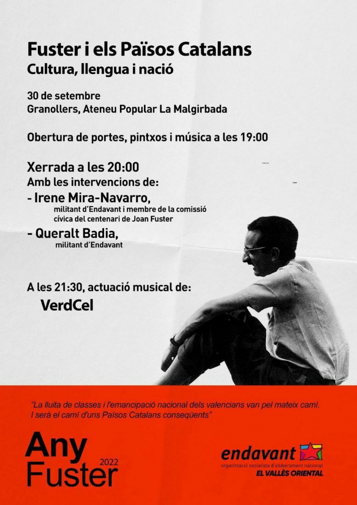 Obertura de portes, pintxos i música, 19.00. Xerrada amb les intervencions d'Irene Mira-Navarro, membre de la comissió cívica del centenari de Joan Fuster, i Queralt Badia, militant d'Endavant, 20.00. Actuació musical de VerdCel, 21.30.