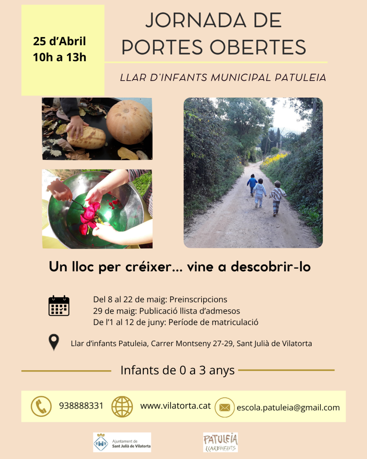El 25 d’abril, de 10 a 13 h, la Llar d’Infants Municipal Patuleia obre les portes perquè les famílies puguin conèixer un espai pensat per créixer, jugar i descobrir el món amb calma i afecte.