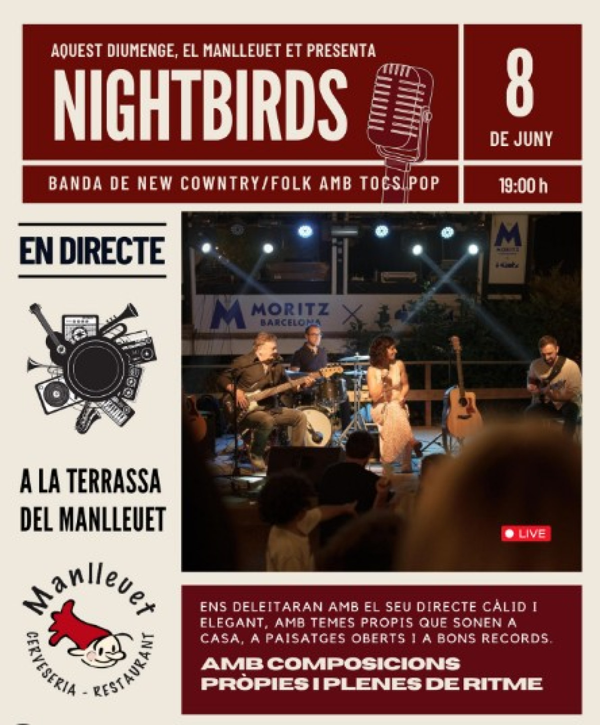 Aquest 8 de juny a les 19:00 h ens visiten els Nightbirds @nightbirdsworld , una banda amb ànima folk i pinzellades de pop que t’atraparan des de la primera nota.