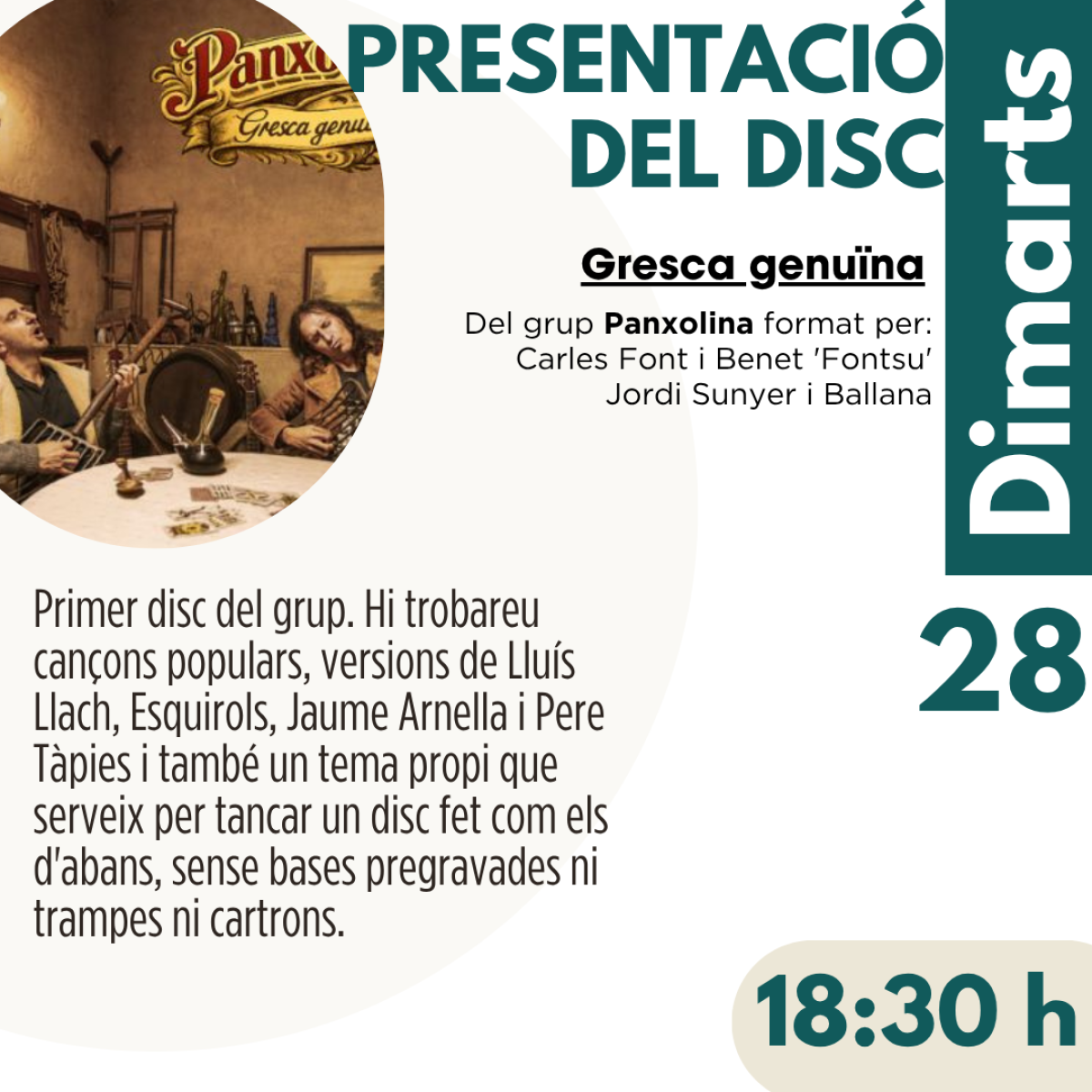El grup Panxolina, format per Carles Font “Fontsu” i Jordi Sunyer, presenta el disc Gresca genuïna. El treball recull cançons populars, versions de Lluís Llach, Esquirols, Jaume Arnella i Pere Tàpies, i un tema propi que tanca un disc enregistrat “com els d’abans”, sense bases pregravades ni artificis.