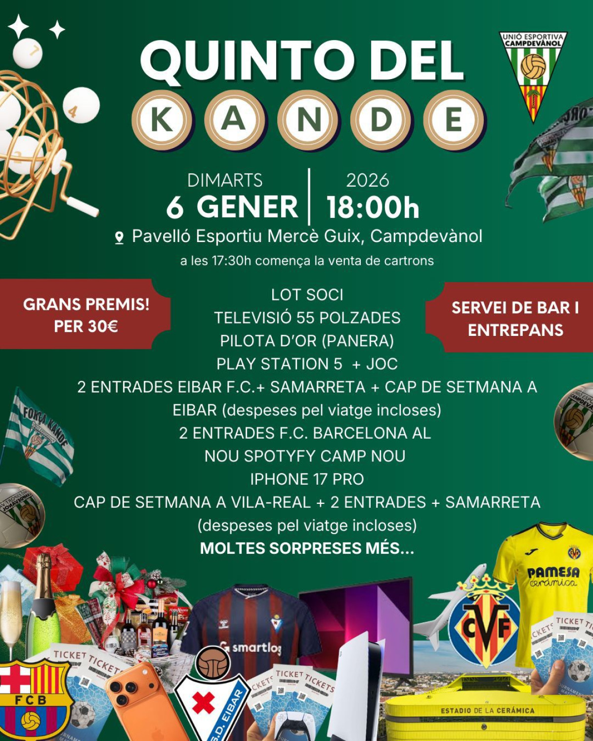 Quinto amb grans premis: Televisió 55 polzades, 2 entrades Nou Spotifiy Camp Nou, Iphone 17 Pro i moltes sorpreses més. 17:30 Venta de cartrons
