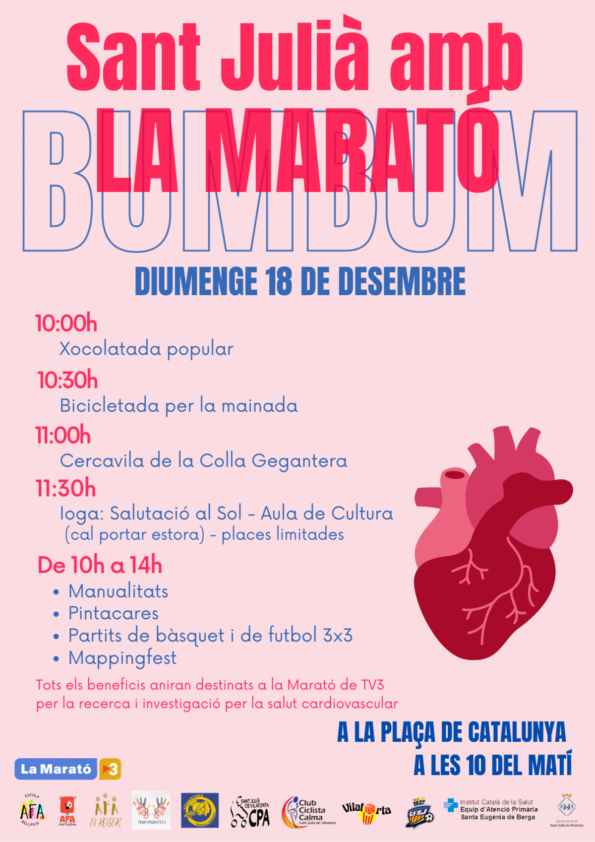 Tots els beneficis recaptats amb les diferents activitats aniran destinats a la Marató de TV3 que aquest any es dirigeix a a la recerca i la investigació per a la salut cardiovascular. Per aquest motiu, us animem a tots i a totes a participar-hi i a contribuir en la causa!