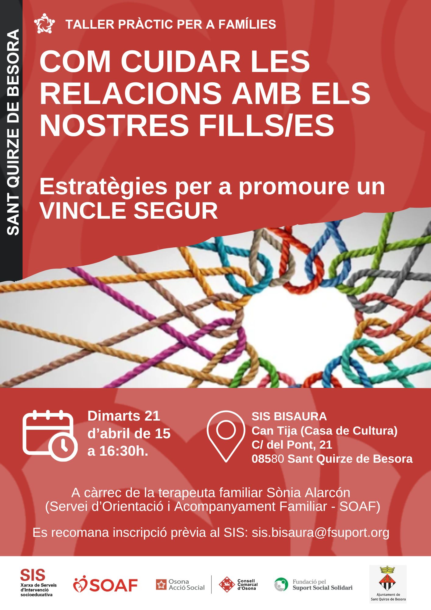 Taller pràctic gratuït per a famílies sobre com cuidar les relacions amb els fills/es. Oferirà estratègies, reflexió i eines per enfortir el vincle. A càrrec de la terapeuta Sònia Alarcón.