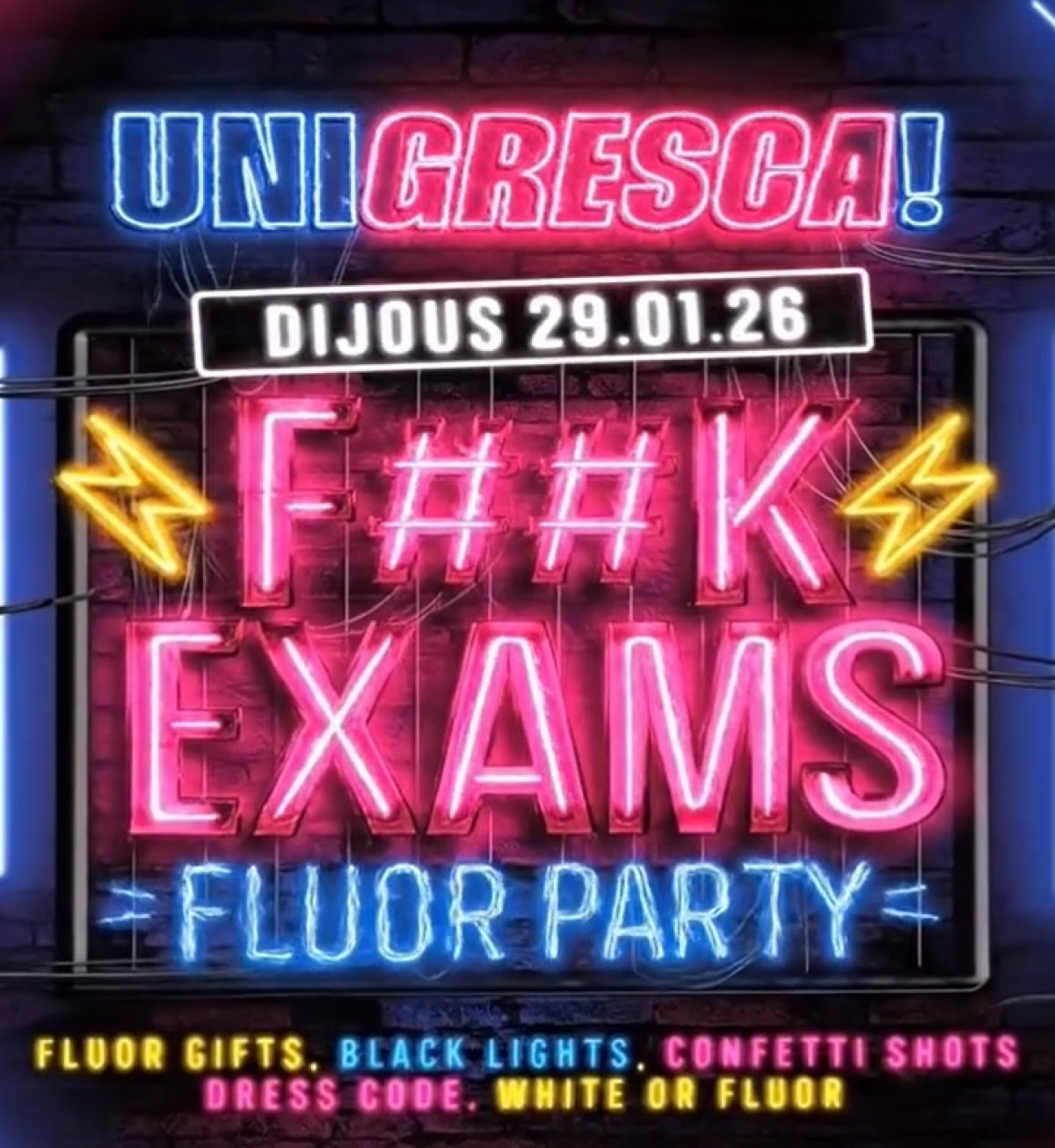 Unigresca us porta la primera festa de la teemporada 2026!! F***CK EXAMS - FLUOR PARTY🩷✨💣
